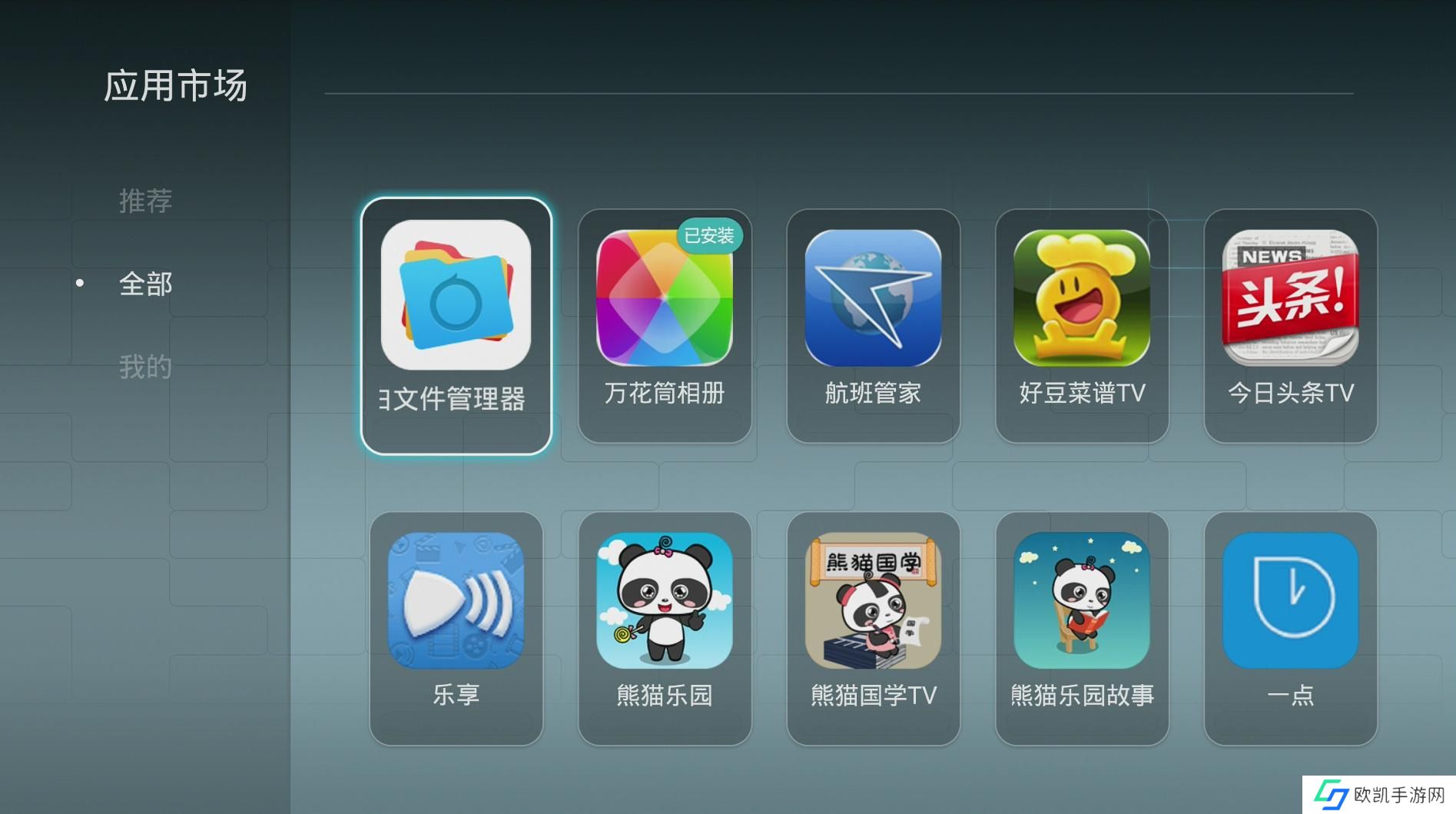 2、保证盒子和电脑连接到了同一wifi,打开华为荣耀盒子,切换到“应用”分类,打开系统自带的应用市场。在自带的应用市场里找到小白文件管理器,下载并安装。
