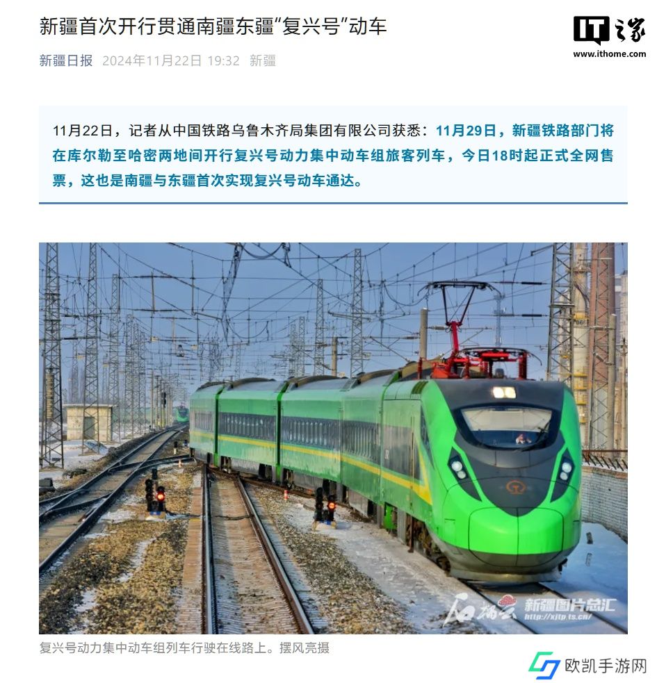 本站 11 月 23 日消息,据《新疆日报》昨日报道,11 月 29 日,新疆铁路部门将在库尔勒至哈密、哈密至库尔勒间加开“复兴号”动力集中动车组旅客列车,首次实现新疆南疆与东疆之间的“复兴号”列车贯通开行。