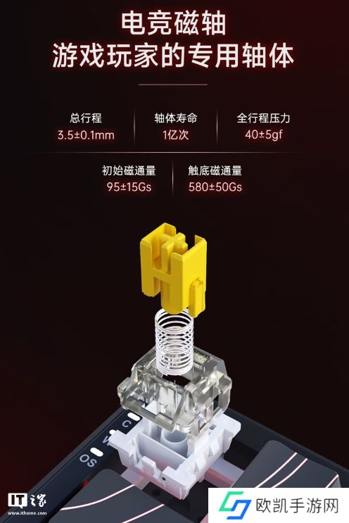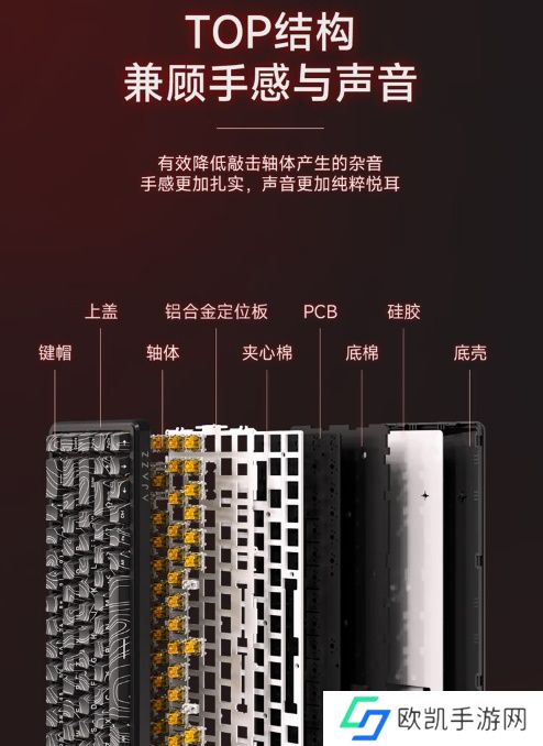 黑爵AK680 MAX 磁轴键盘全系采用 TOP 结构,使用铝合金定位板,配备磁稻轴 hifi 版(总行程 3.5±0.1mm、寿命约 1 亿次、全行程压力 40±5gf、初始磁通量 95±15Gs、触底磁通量 580±50Gs)。