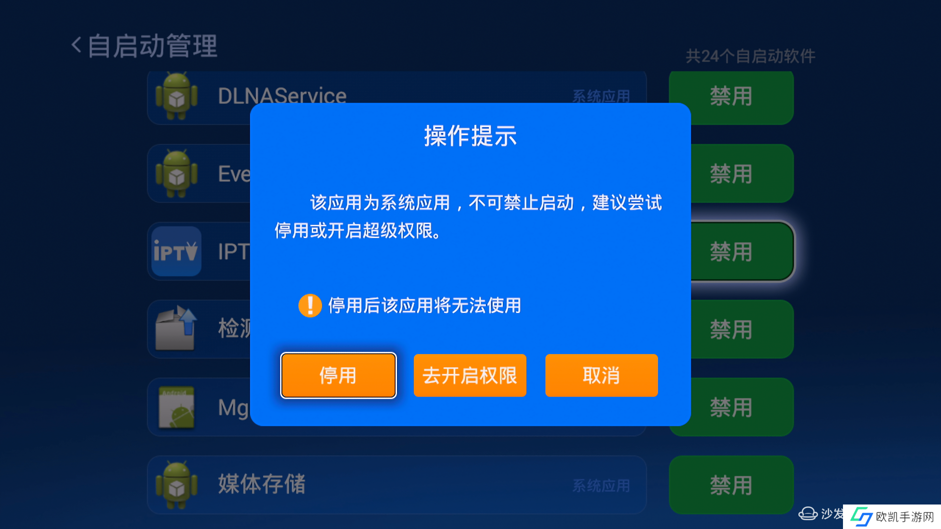 3.接着进入沙发管家---工具箱---自启动管理,找的系统应用--检测更新,点击“禁用”,此时会有窗口弹出,选择“停用”即可;