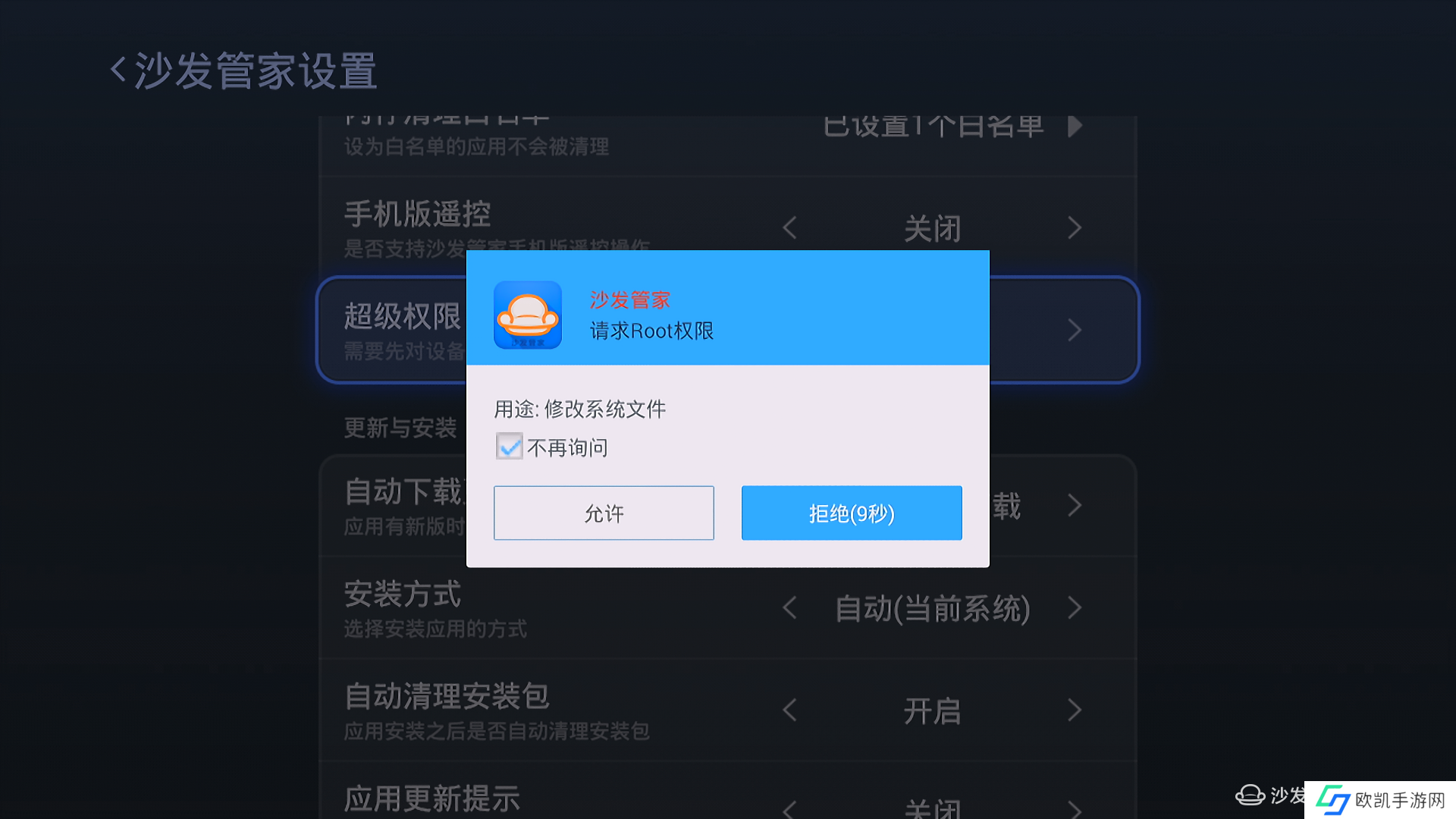 2.找到“超级权限”选项,将超级权限开启,开启过程中ROOT软件会申请权限的弹窗,不同ROOT软件,弹窗略有不同,此时选择“允许”,让沙发管家获取最高权限。