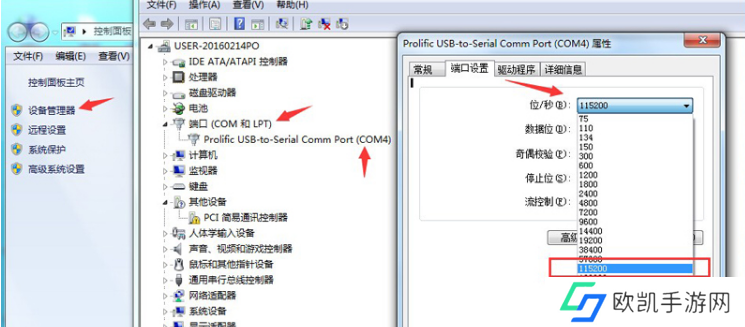 二、插入tll线的USB接口到电脑之后,需要大家先安装ttl的驱动,驱动安装完成之后,右键我的电脑——属性——设备管理器——端口——COM"X"(X就是最后位数字)——属性——端口设置——改为“115200”——确定;