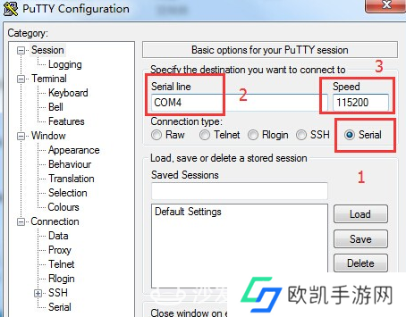 三、打开putty,按图中的顺序设置即可,COM后面的数字按照自己电脑的数字输入即可,记得插上U盘;