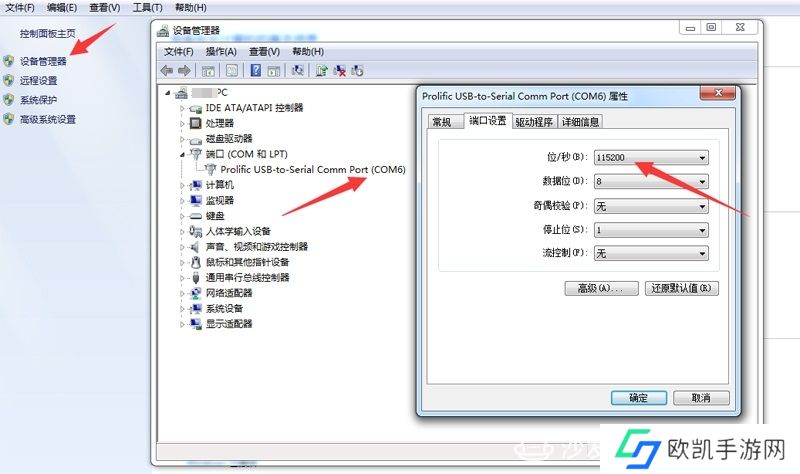 4.插入ttl线的USB接口到电脑之后,需要大家先安装ttl的驱动,驱动安装完成之后,右键我的电脑——属性——设备管理器——端口——COM"X"(X就是最后位数字)——属性——端口设置——改为“115200”——确定;