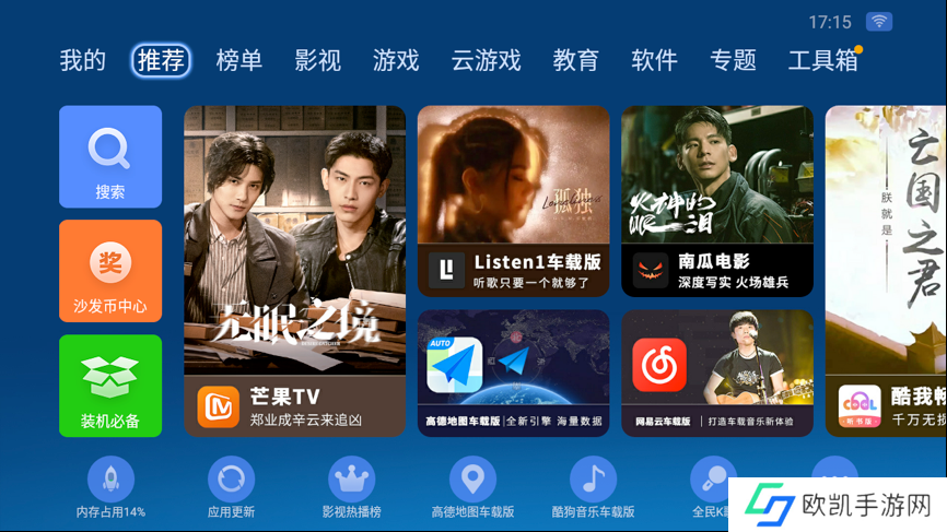 安装完成后打开沙发管家车载版应用市场,想下载什么软件直接搜索即可~也可以根据榜单来下载一些热门应用,比如腾讯视频、爱奇艺、抖音、快手、酷狗、网易云、QQ音乐、懒人听书等。