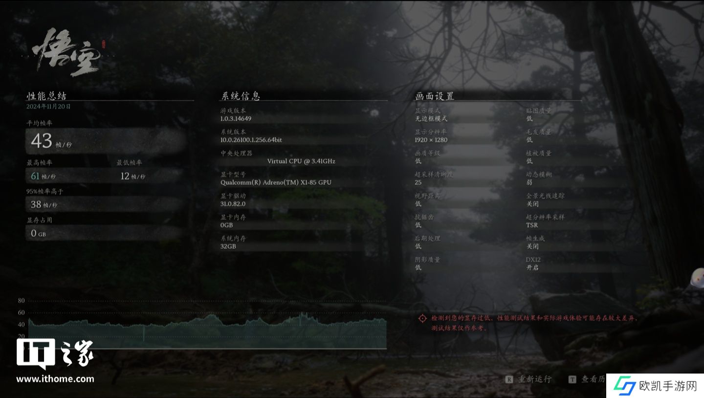 根据本站小伙伴投稿的测试成绩,在 1920×1280 的显示分辨率、低画质下,骁龙 X Elite 设备在《黑神话:悟空》中取得了平均帧 43 帧 / 秒的成绩,其中 95% 帧率高于 38 帧 / 秒。