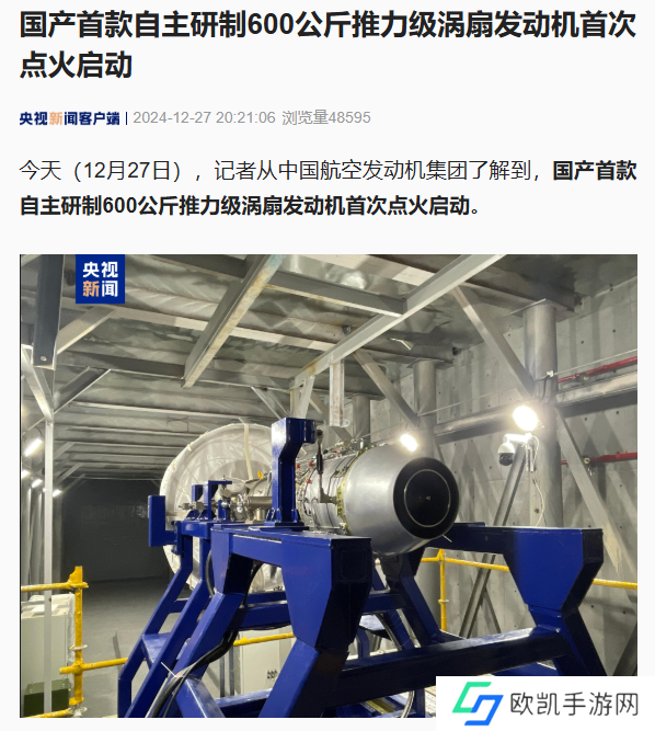 本站 12 月 27 日消息,据央视新闻报道,中国航空发动机集团开发的国产首款自研 600 公斤推力级涡扇发动机今日完成首次点火启动。