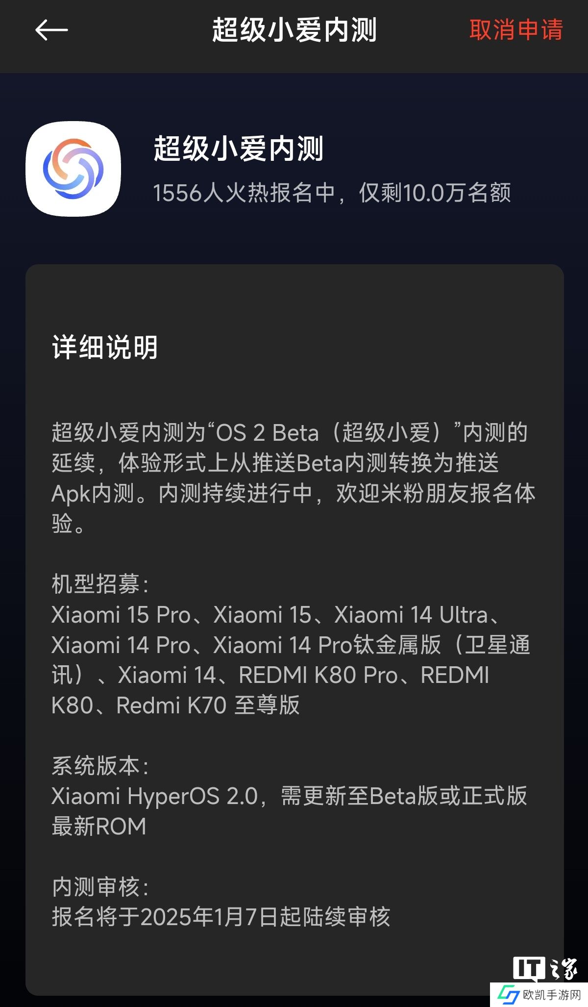 本站 12 月 27 日消息,小米“超级小爱”现开启内测招募,详细说明显示超级小爱内测为“OS2 Beta(超级小爱)”内测的延续,体验形式上从推送 Beta 内测转换为推送 Apk 内测。