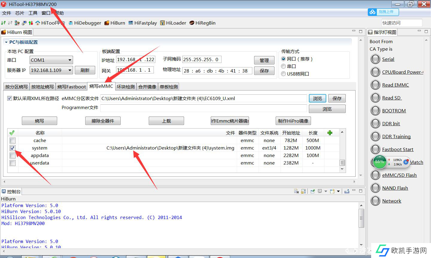 (2)打开hitool5.0.8刷机工具,盒子主板连接好网线,芯片选择正确,只有system.img 前面勾选,其余不要勾,注意勾选项目要有路径。具体设置如下图所示