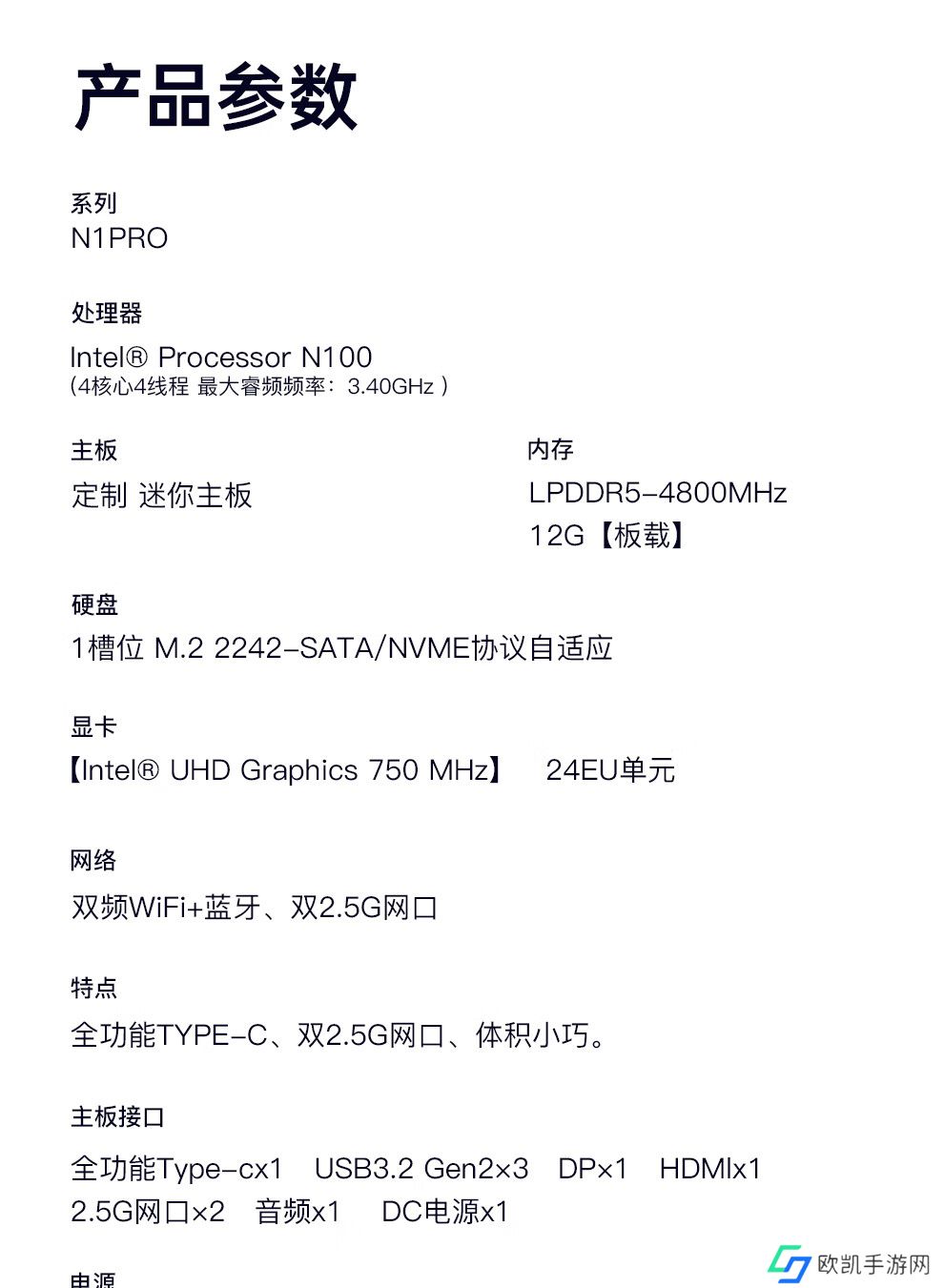 天钡 N1 Pro 迷你主机搭载英特尔 N100 处理器,4 核心 4 线程;板载 12GB LPDDR5 4800MHz 内存,固态硬盘采用 M.2 2242 规格;使用铜管散热器与涡轮扇叶进行散热。