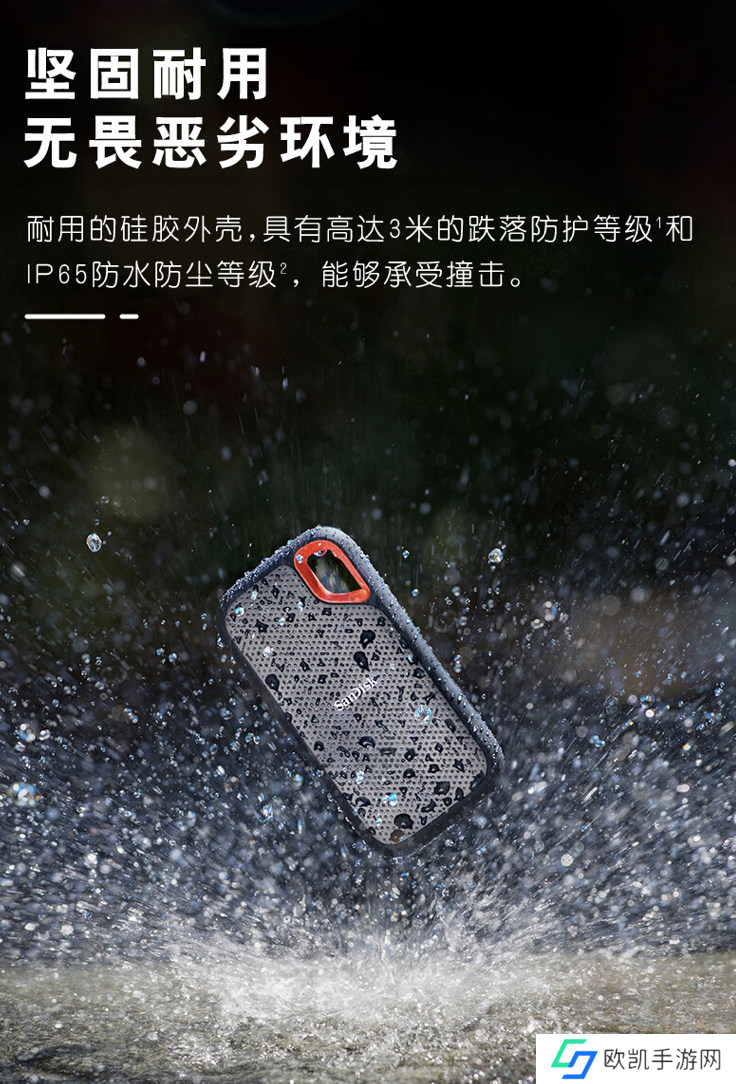 这款硬盘采用硅胶外壳,尺寸100.8 x 52.55 x 9.6 mm,号称拥有高达3米跌落防护等级和IP45防水防尘,拥有5年质保,支持 256 位AES硬件加密,硬盘配有安全扣环,可随时外接到皮带环和背包上。