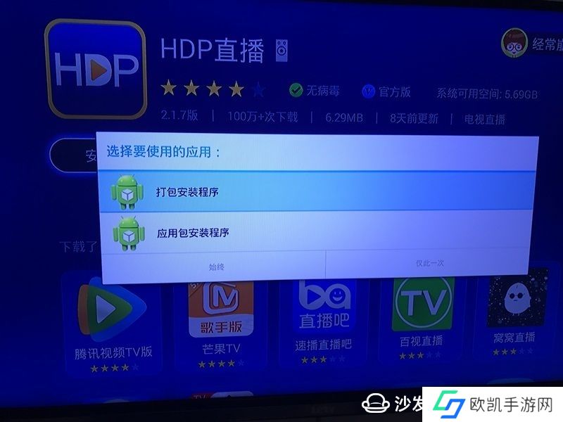 7,切换成功后,在沙发桌面的设置里开启wifi,搜索你家无线名字,然后输入密码,连上wifi,连接成功后,在沙发桌面找一个叫沙发管家的应用,点进去,下载个HDP直播,能下载,就说明连接成功了,如出现以下界面,选择“应用安装程序”。若不成功,拔掉网线重启盒子。