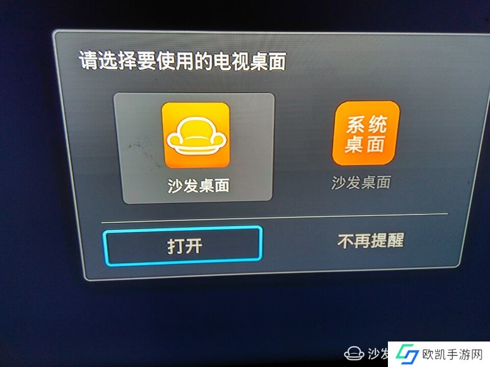 接下来按遥控器“首页”键会弹出默认桌面选择,选择沙发桌面,然后点击“不再提醒”。