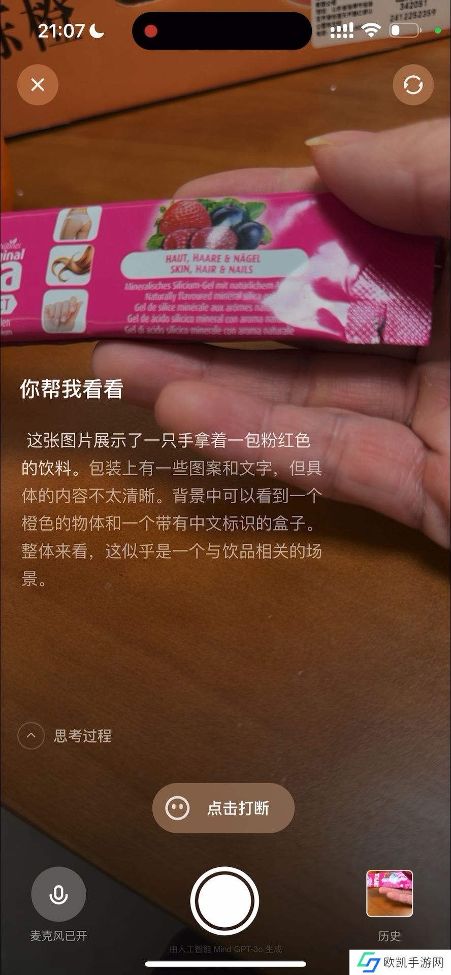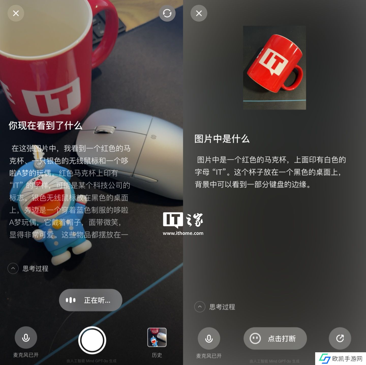 另外,在“理想同学”的交流功能页面底部,提供视频、语音、键入功能,进入视频功能后即可使用理想同学 App 的视觉感知能力,可向其询问预览框内的物品内容信息,支持实时画面询问和拍摄询问。相关页面显示,其回复内容由人工智能 Mind GPT-3o 生成。