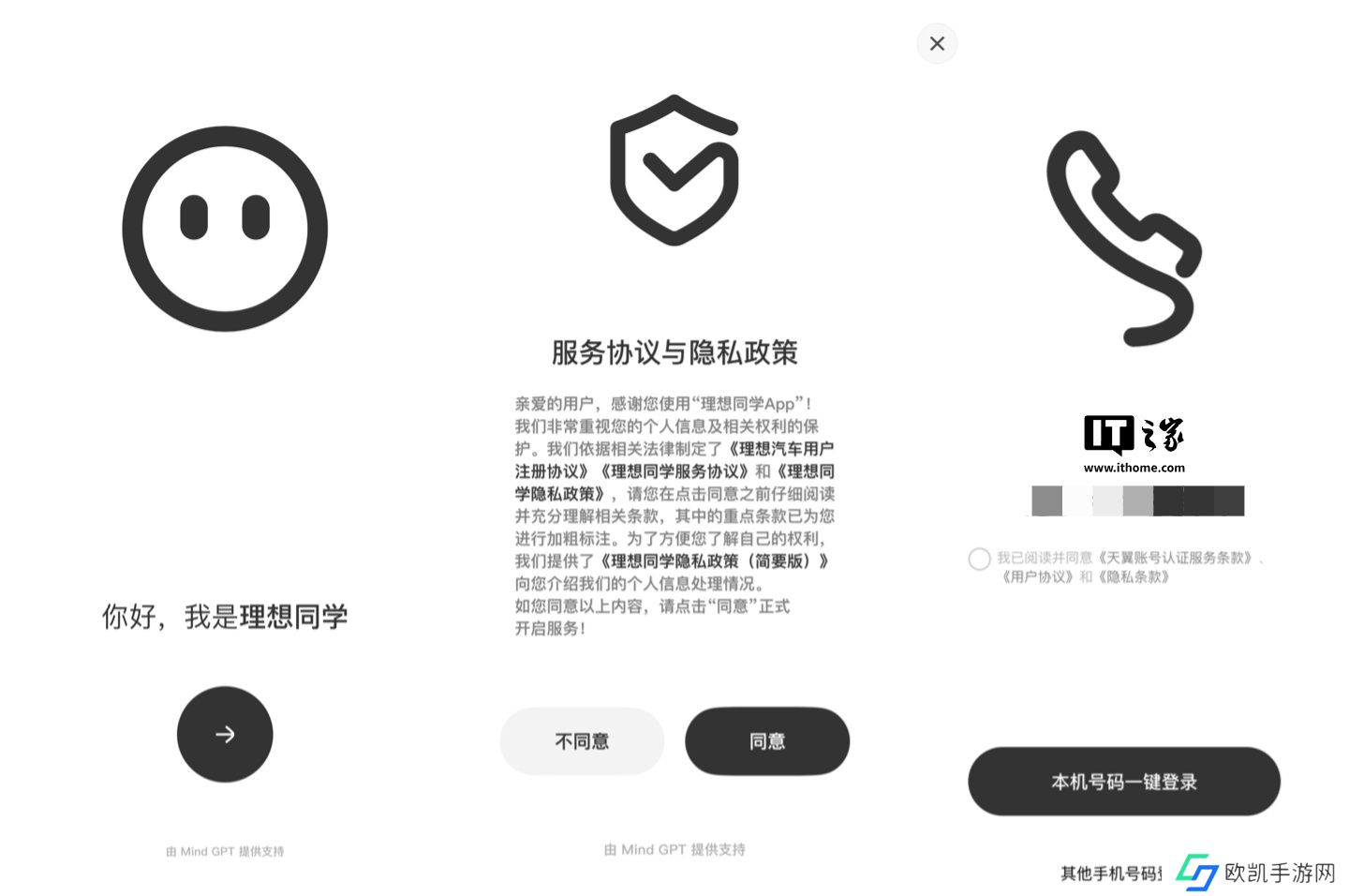 本站实测,打开应用后将进入使用引导,包括产品简介、服务协议与隐私政策、登录(支持本机号码一键登录)。另外,引导页面显示 App 由 Mind GPT 提供支持。
