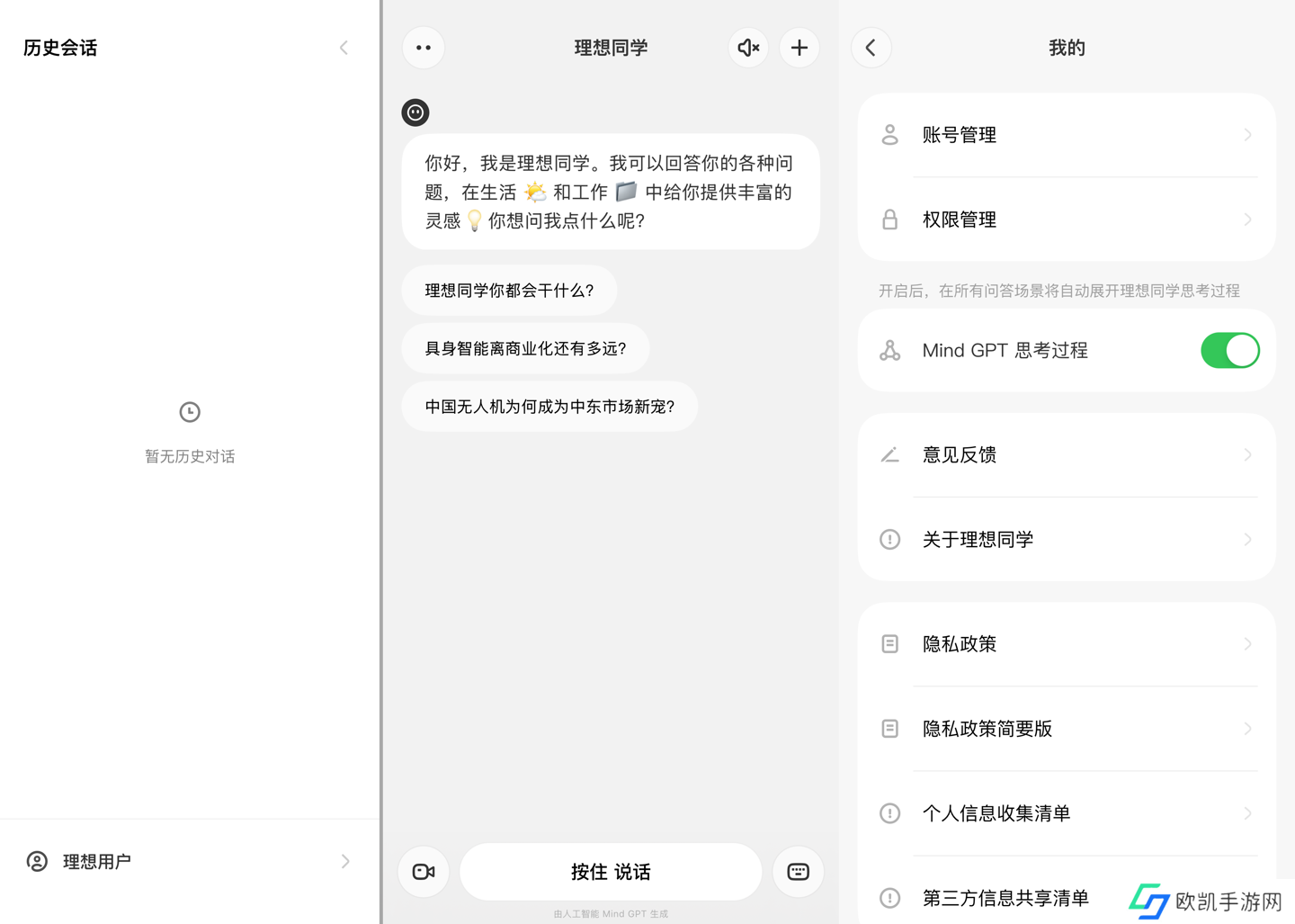 进入应用后会直接进入“理想同学”的交流功能页面,可在此直接和理想同学交流,支持技能查询、知识问答、长英文词句翻译、文本生成等。向右滑会进入“历史会话”页面,继续点击页面底部的“理想用户”则会进入“我的”功能页面,提供账号管理、权限管理等设置内容。