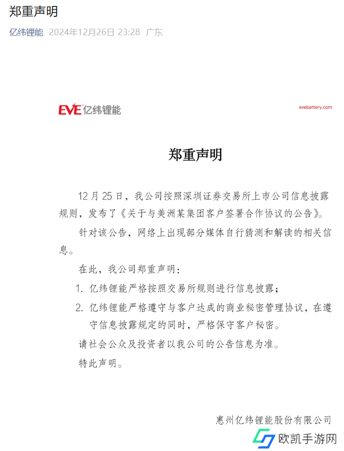 本站 12 月 27 日消息,亿纬锂能昨日晚发布郑重声明,本站附官方声明原文内容如下: