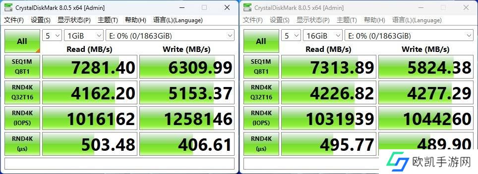 具体到990 EVO PLUS性能实测上CrystalDiskMark结果表现,其顺序读取速度高达7281MB/s,顺序写入速度为6309MB/s,这意味着数据传输速度比上一代产品提升了50%。同时你可以看到4K随机读取已经达到了100W级别IOPS,而4K随机写入更是来到了125W级别IOPS,同级产品已经很难与之相比较。