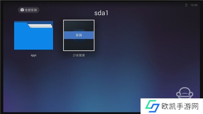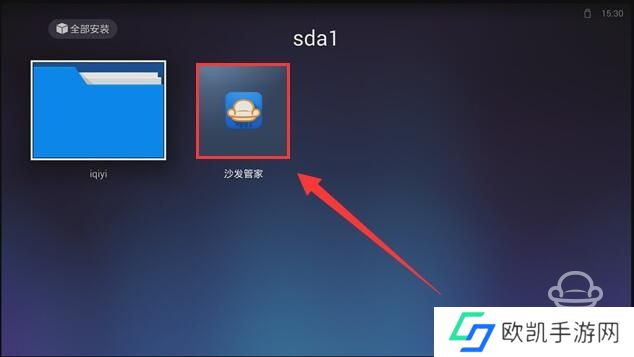 3、进入文件列表界面,找到沙发管家APK安装包,遥控器移动到沙发管家图标上,点击并确认安装即可。