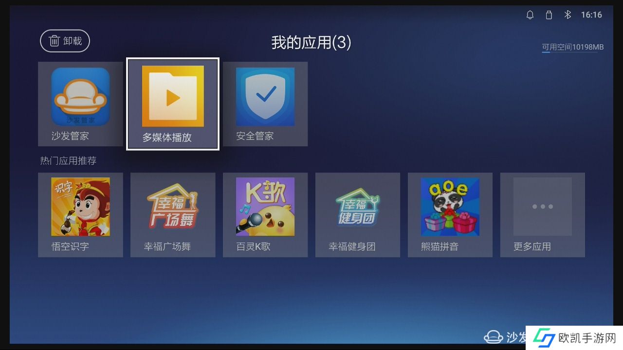 方法二 :如果天猫魔屏投影仪连接U盘没有弹出对话框,可以通过“多媒体播放”—“装应用”识别U盘完成安装,具体如下:1、选择主界面,打开“我的应用”。