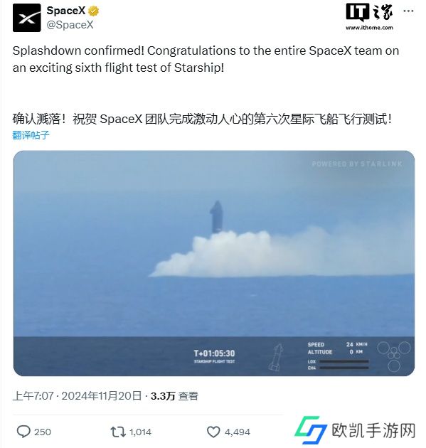 起飞一个多小时后,SpaceX 宣布星舰(S31)在印度洋上成功进行翻转机动和着陆点火,顺利完成水上软溅落 / 软着陆,本次试飞任务**成功。