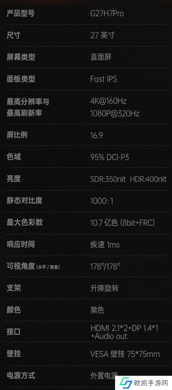 这款显示器配备的Fast IPS面板支持以4K 160Hz或1080P 320Hz显示,其亮度至高400尼特,静态对比度1000:1,响应速度 1ms,支持10-Bit色彩(8-Bit + FRC),覆盖95% DCI-P3色域。