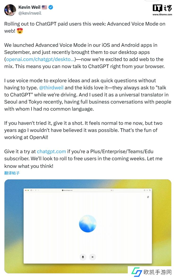 本站 11 月 22 日消息,北京时间本周三凌晨,OpenAI 首席产品官凯文・威尔(Kevin Weil)通过 X 平台确认,高级语音模式(Advanced Voice Mode)在本周全面上线 ChatGPT 网页版,面向付费用户开启。