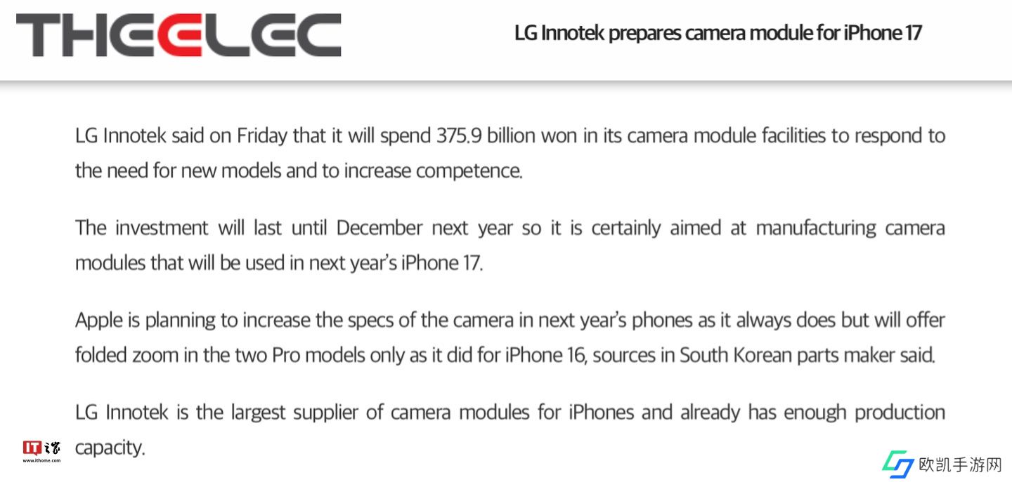 本站 11 月 24 日消息,据外媒The Elec报道,LG Innotek 宣布将投资 3759 亿韩元(当前约 3.92 亿元人民币)用于其摄像头模组生产设施,以满足新机型需求并提升竞争力。这项投资计划将持续至明年 12 月,据称是为了生产将用于 iPhone 17 的摄像头模组。