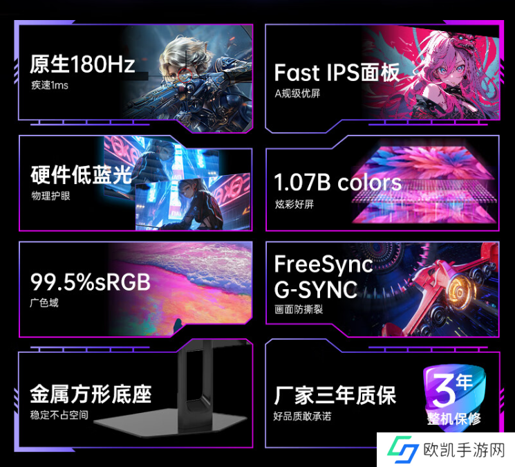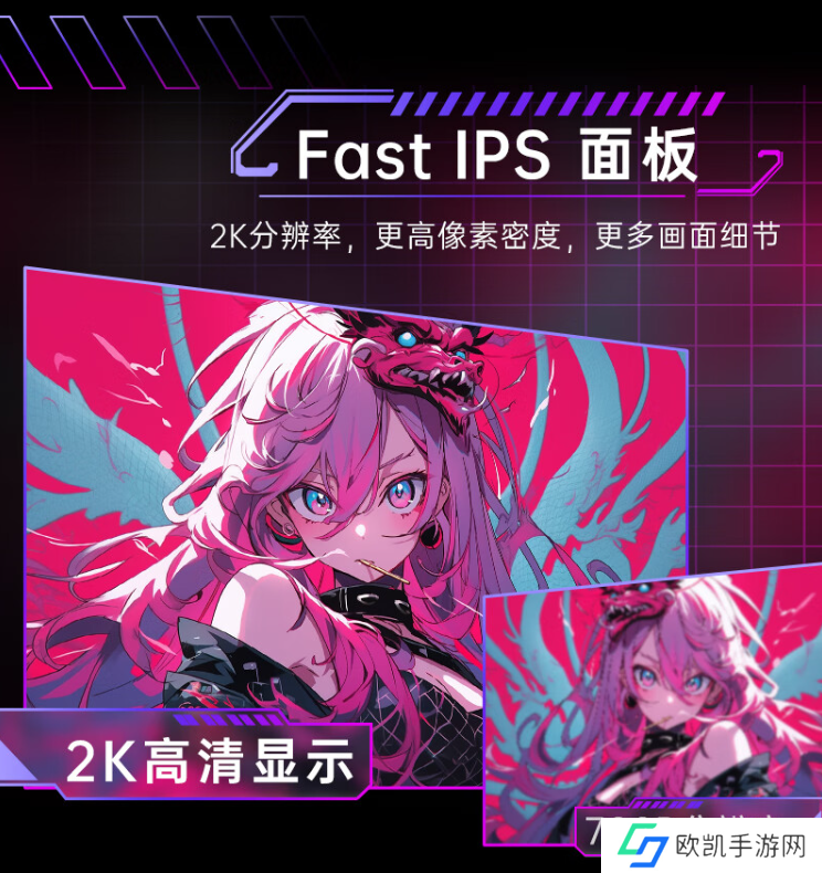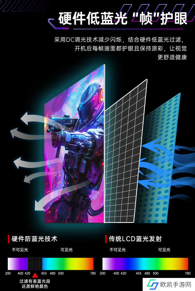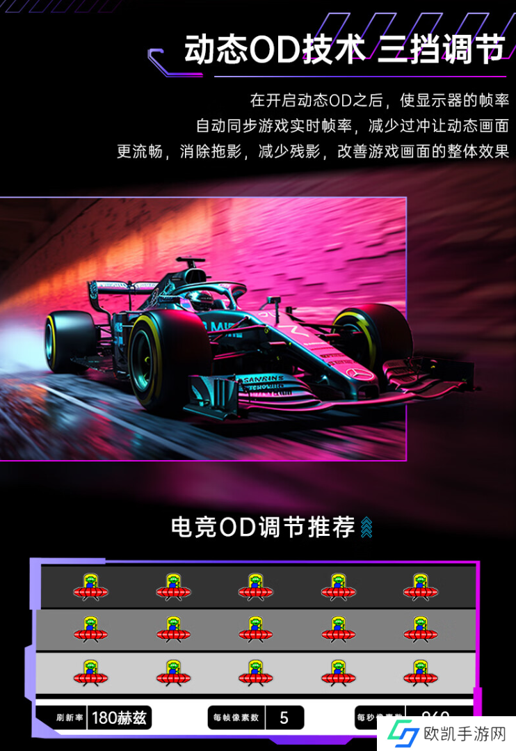 该款显示器采用 DC 调光技术减少闪烁、支持 10.7 亿色显示和动态 OD 技术(三挡可调),官方称开启动态 OD 后显示器帧率可自动同步游戏实时帧率,可减少残影、消除拖影。