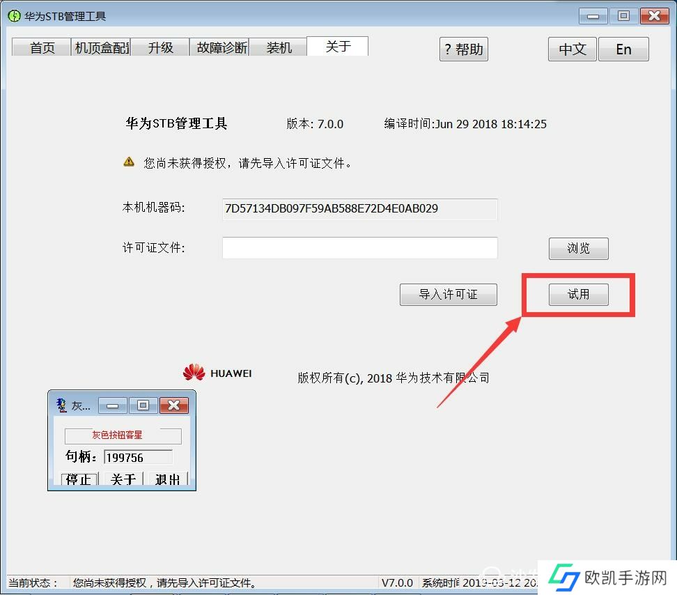 由于目前网络上没有可以通用的授权文件或者软件破解版,我们打开软件是无法使用的,除了"中文"" EN" "浏览"“导入许可” 几个按钮外其它按钮均点击无效,于是乎突然想起N年以前用过的一款小软件“灰色按钮克星”先打开“灰色按钮克星”点击“激活” 按钮 ,再打开STB管理工具,会发现STB管理工具“试用”按钮可用了