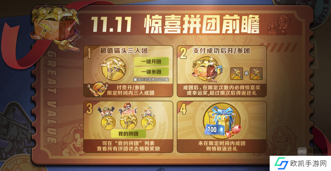 而大家未及时领取的奖励(包含惊喜奖/幸运奖/返还奖励)会通过邮件发送到你的邮箱。指挥官们一定要预留充足时间进行拼团组队,拼团超时或活动结束后都会立刻结算所有未领取奖励。