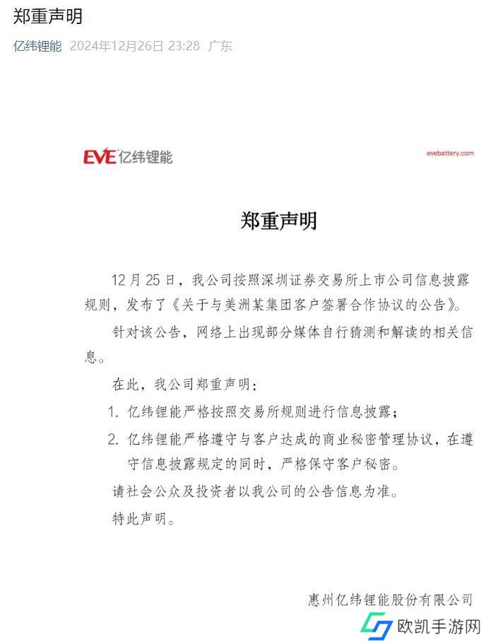 12 月 27 日消息,亿纬锂能昨日晚发布郑重声明,附官方声明原文内容如下: