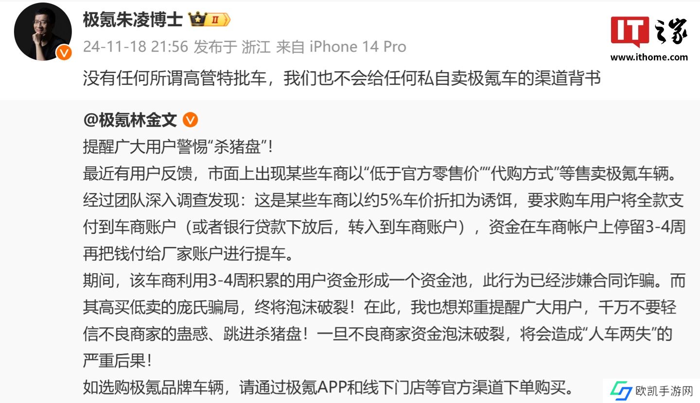 本站 11 月 18 日消息,极氪智能科技副总裁林金文今日发文,称提醒广大用户警惕“杀猪盘”。