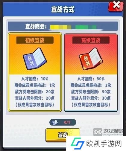 发起宣战后,商会成员可对目标商会的指定成员发起挑战,初次攻击可给发起宣战者提供额外积分奖励。