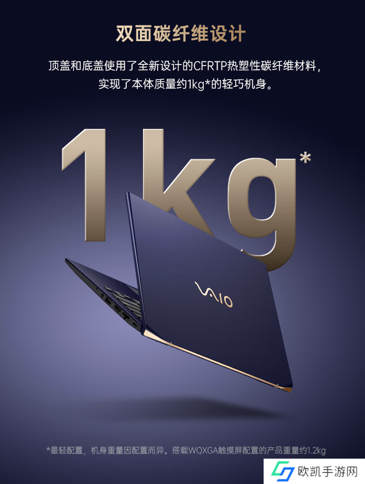 该机 A、D两面采用CFRTP热塑性碳纤维复合材料,兼具高强度和低密度两大优势。笔记本主体使用“勝色”配色,前端切角边缘使用金色配色,整体重量1.2千克,整体通过了MIL-STD-810H军规质量测试,同时拥有“VAIO独特的下沉转轴设计”。