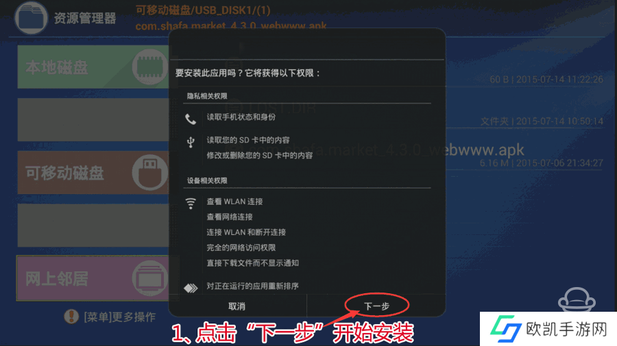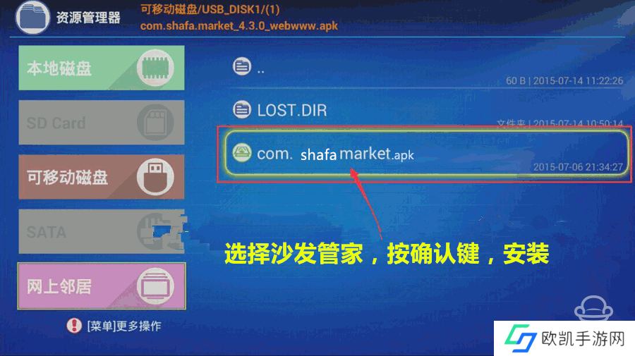 3、打开【U盘设备】,按照提示找到沙发管家apk文件,点击安装