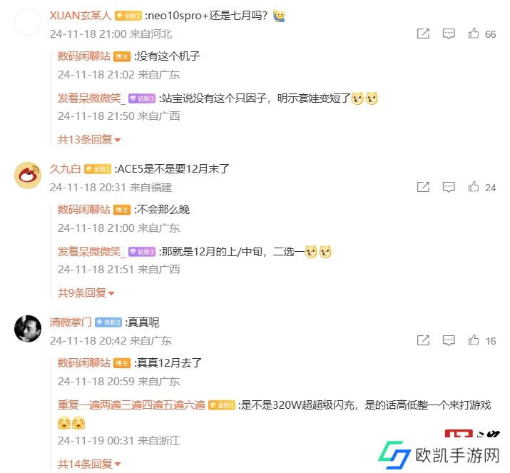 博主还在评论区中回复了部分网友问题:针对 iQOO Neo10S Pro+ 机型是否在 7 月(此处预计指明年)发布,博主称“没有这个机子”;针对一加 Ace 5 系列手机是否在 12 月末发布,博主回复“不会那么晚”;针对 realme 真我新机发布时间,博主表示“真真 12 月去了”。