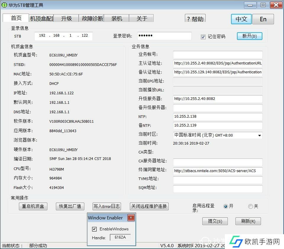 河南联通测试通过,在6108包的基础上修改的,注意:提示命令非法的是STB版本不对,请试着使用STB4.03或升级下机顶盒,适用型号:EC6108V9_V9U_V9E_V9A_V8,EC6109U,暂不适用EC6110M、T破解条件:盒子网线连接,另外一端接路由器,路由器和电脑在同一个局域网内;切勿将盒子连接光猫文件链接::https://pan.baidu.com/s/1cqhx0LjbXoajSi7OC8N6nQ 提取码:s0uo备选链接1:https://share.weiyun.com/Z9loIqtM 密码:zgt8hf备选链接2:https://115.com/s/sw3vb3u3z1i# 访问码:h6c11、打开文件夹中:enabler.exe