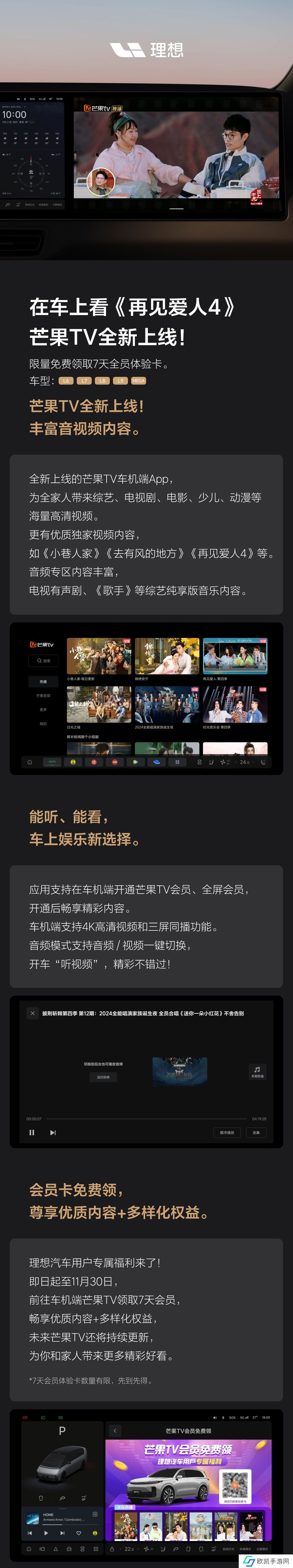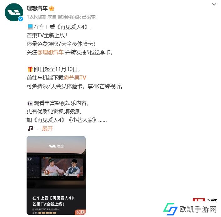 本站 11 月 21 日消息,理想汽车今日发文宣布,芒果 TV 车机版上线L6 / L7 / L8 / L9 / MEGA 车型,用户前往车机端下载芒果 TV 可免费领 7 天会员体验卡。