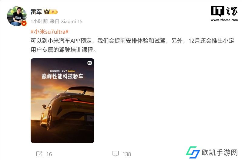 小米创办人、董事长兼 CEO 雷军今晚也透露,用户在预定小米 SU7 Ultra 之后,官方会提前安排体验和试驾,12 月将推出小定用户专属的驾驶培训课程。