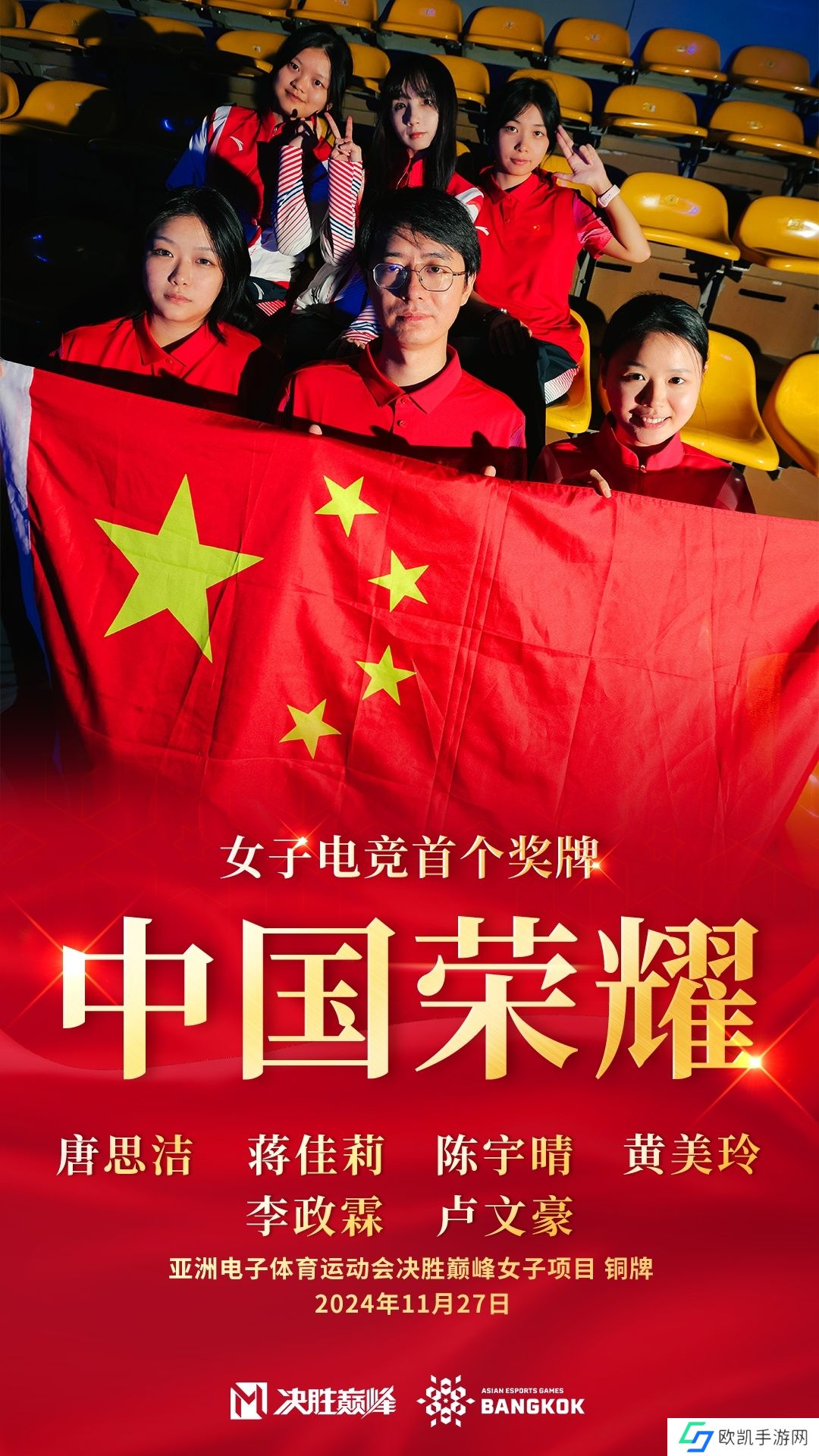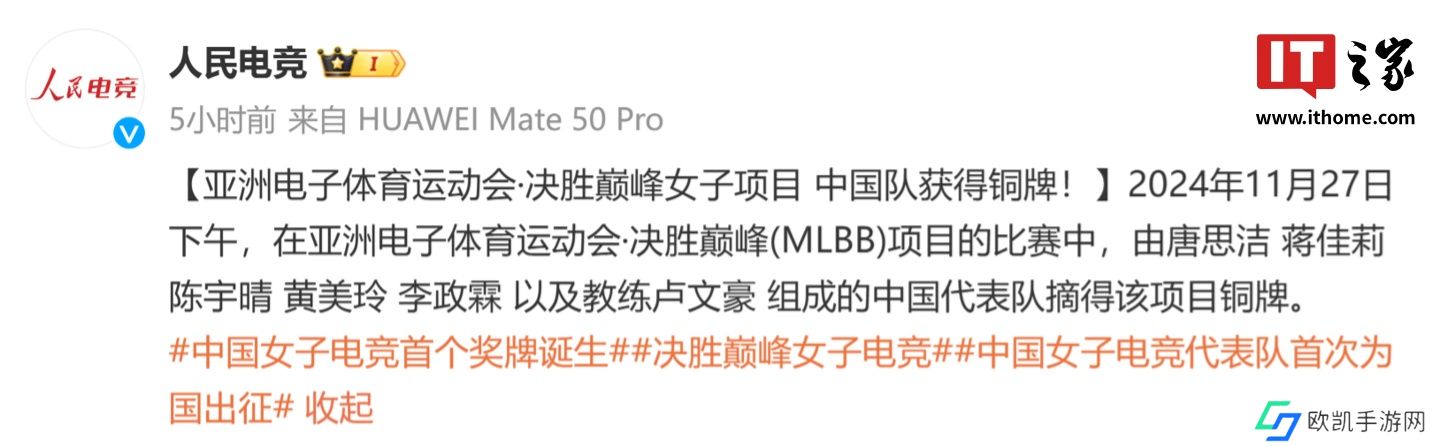 本站 11 月 27 日消息,据 @人民电竞 消息,2024 年 11 月 27 日下午,在亚洲电子体育运动会・决胜巅峰(MLBB)项目的比赛中,由唐思洁、蒋佳莉、陈宇晴、黄美玲、李政霖以及教练卢文豪组成的中国代表队摘得该项目铜牌。拿下中国女子电竞历史的首枚奖牌。