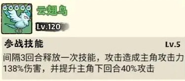 1、首先来看云翅鸟技能:3回合一次且能直接百分比提高人物攻击,满级可达百分40,相比于绿色宠物里牛的击晕、蜥蜴的防御,鸟的技能更具进攻性
