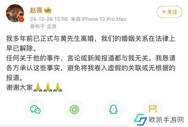 12月28日,赵薇发文官宣与黄有龙离婚,两人于2008年结婚,多年前已解除婚姻关系。赵薇称:“我多年前已正式与黄先生离婚,我们的婚姻关系在法律上早已解除。任何关于他的事件、言论或新闻报道都与我无关。我恳请各方承认这些事实,避免将我卷入虚假的关联或无根据的报道。”