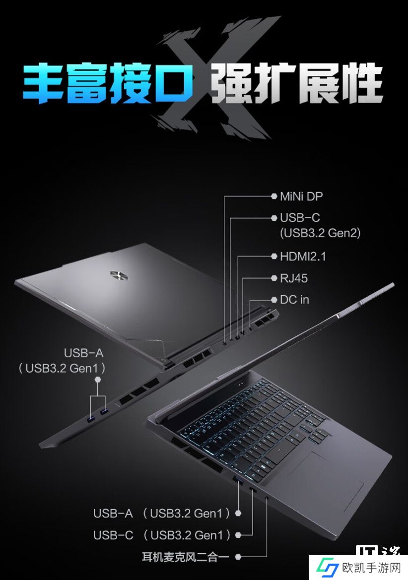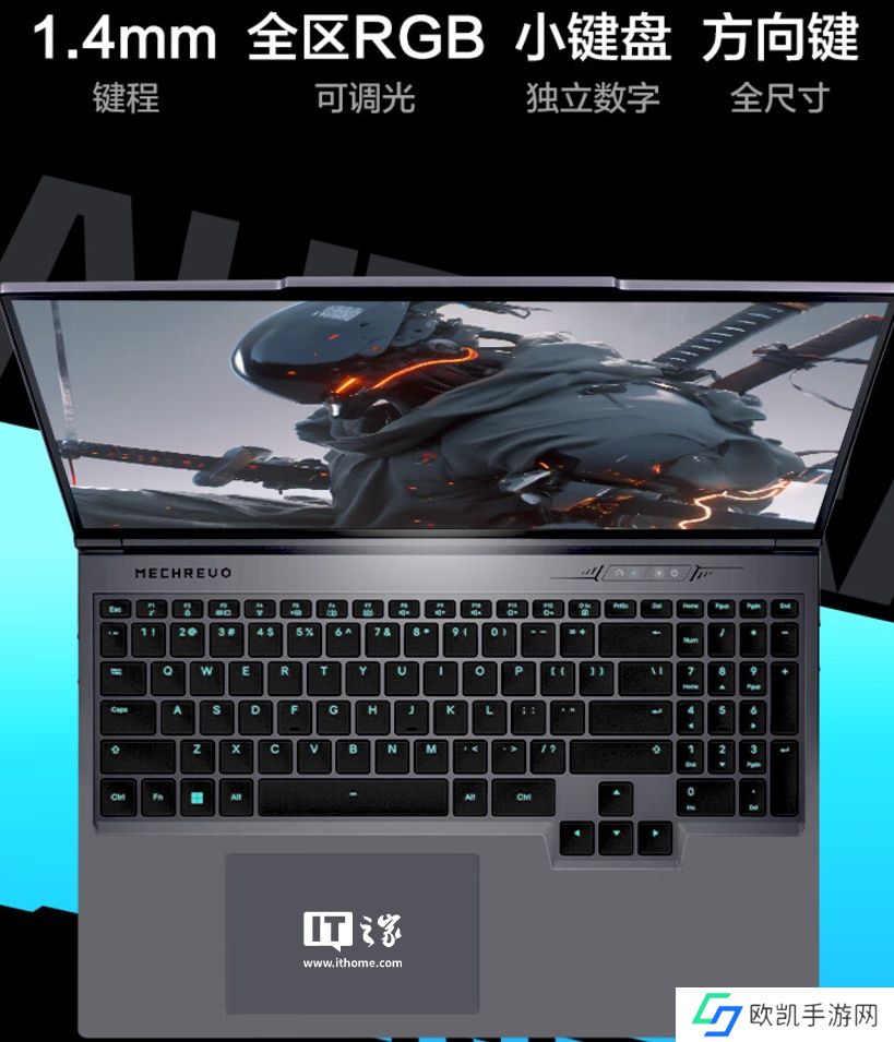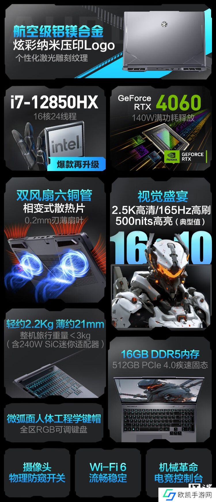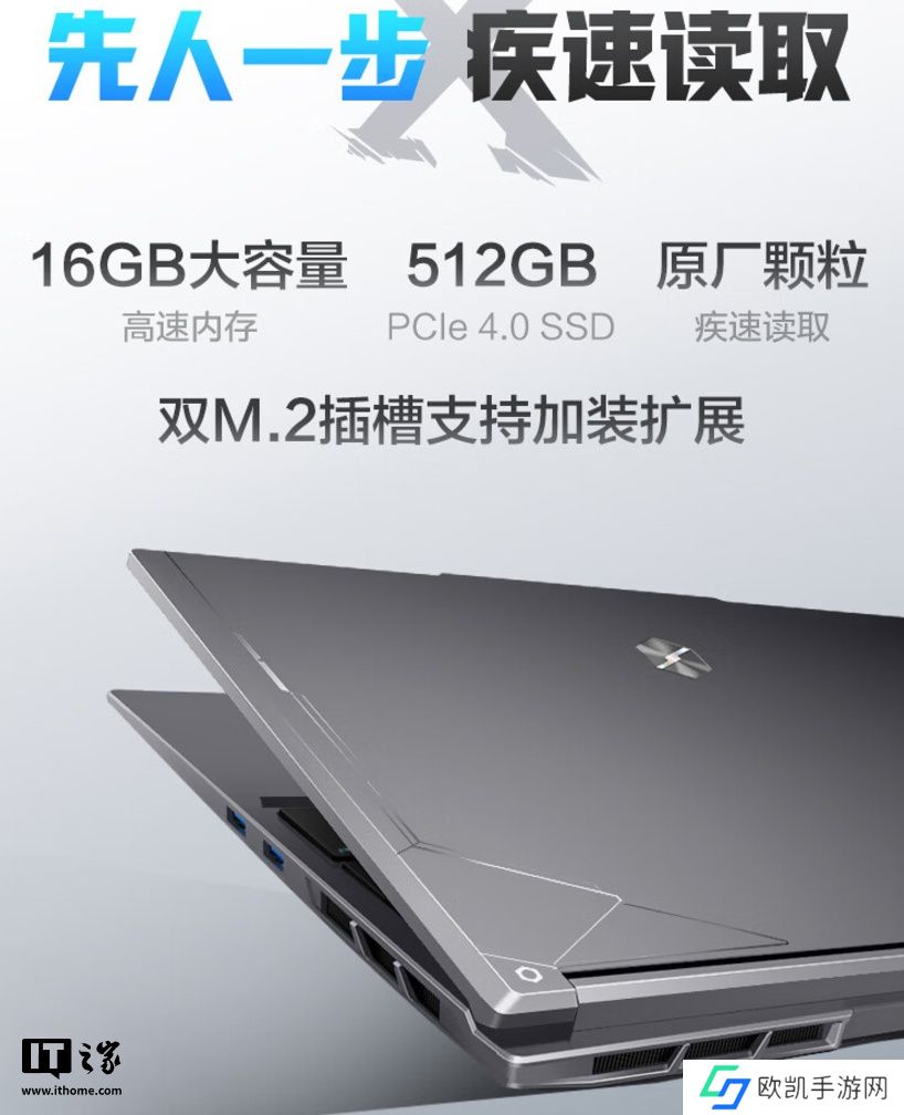 这款笔记本内置 16GB DDR5 RAM + 512GB PCIe 4.0 SSD,采用铝镁合金机身 + 纳米压印 Logo 设计。电脑还配备全区 RGB 可调键盘,整体重量约 2.2kg、厚度约 21mm。