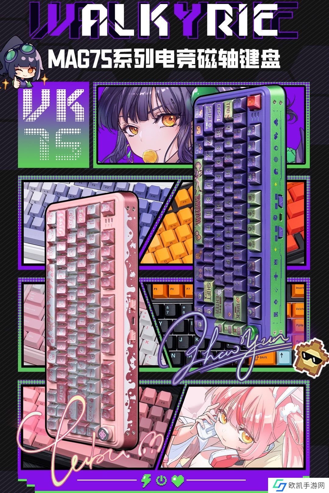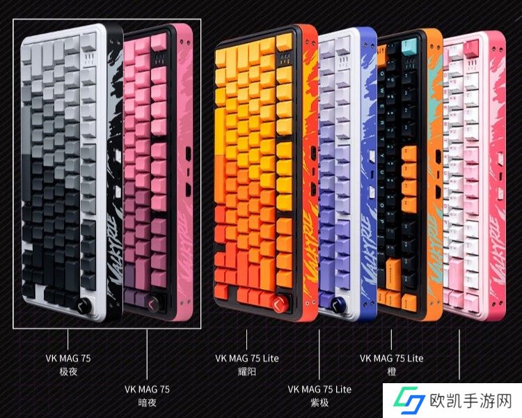 VK MAG 75 系列机械键盘全系支持 8KHz 回报率和 32K 扫描率,内部采用铝合金定位板 + PO 夹心棉 + 硅胶底垫的填充结构,全键支持热插拔,配备特挑弱磁干扰卫星轴,采用下灯位 RGB 设计。