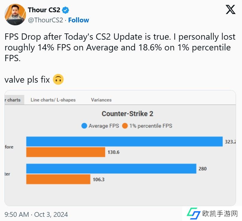 Thour:今天的更新之后,游戏FPS平均降幅达到了14%,而1% FPS的降幅达到了18.6%。