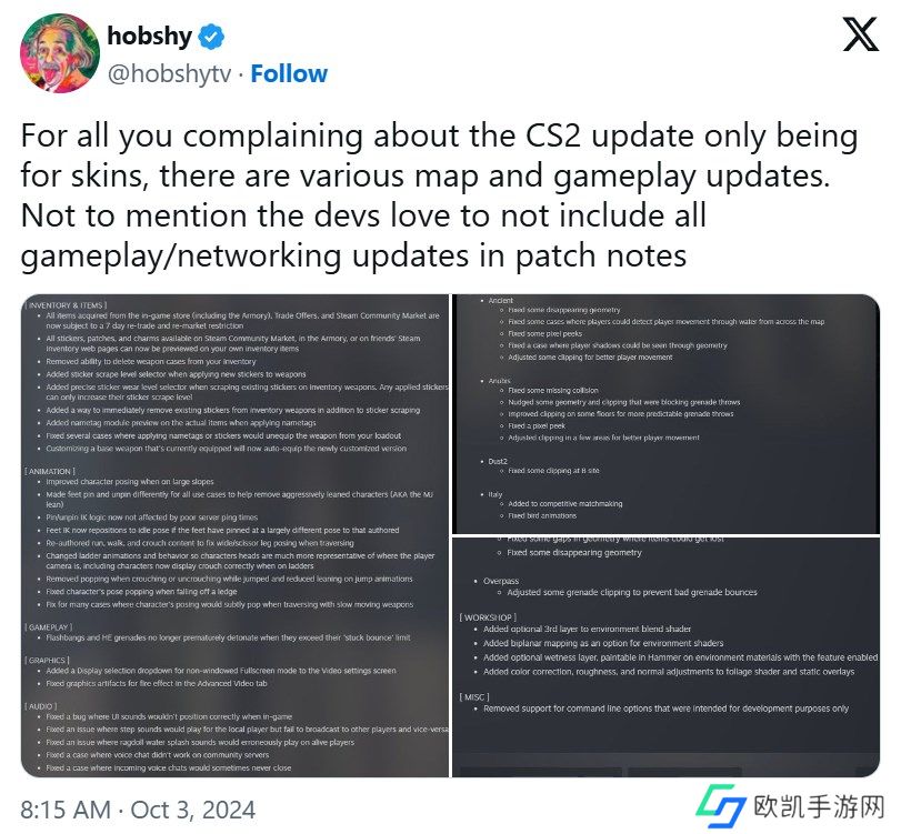 hobshy:对于所有抱怨CS2更新只针对皮肤的人,其实还有各种地图和游戏更新。更不用说开发人员并不喜欢在补丁说明分享所有游戏/网络更新。
