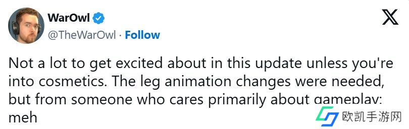 WarOwl:除非你对皮肤感兴趣,否则这次更新没什么好兴奋的。腿部动画的改动是必要的,但对于一个主要关心游戏玩法的人来说:...