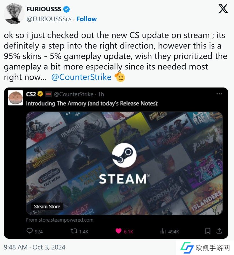 FURIOUSSS:好的,我刚刚看了新CS更新;这无疑是朝着正确方向迈出的一步,然而这是一个95%皮肤+5%游戏玩法的更新,希望他们能更优先考虑游戏玩法,特别是因为这是当前最需要的...