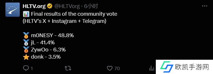 如今投票已经结束,而从最终的结果看,m0NESY得票率最高,为48.8%,原本的第一jL被m0NESY绝地翻盘屈居第二,得票率为41.4%。ZywOo为6.3%,donk最少,仅有3.5%的得票率。